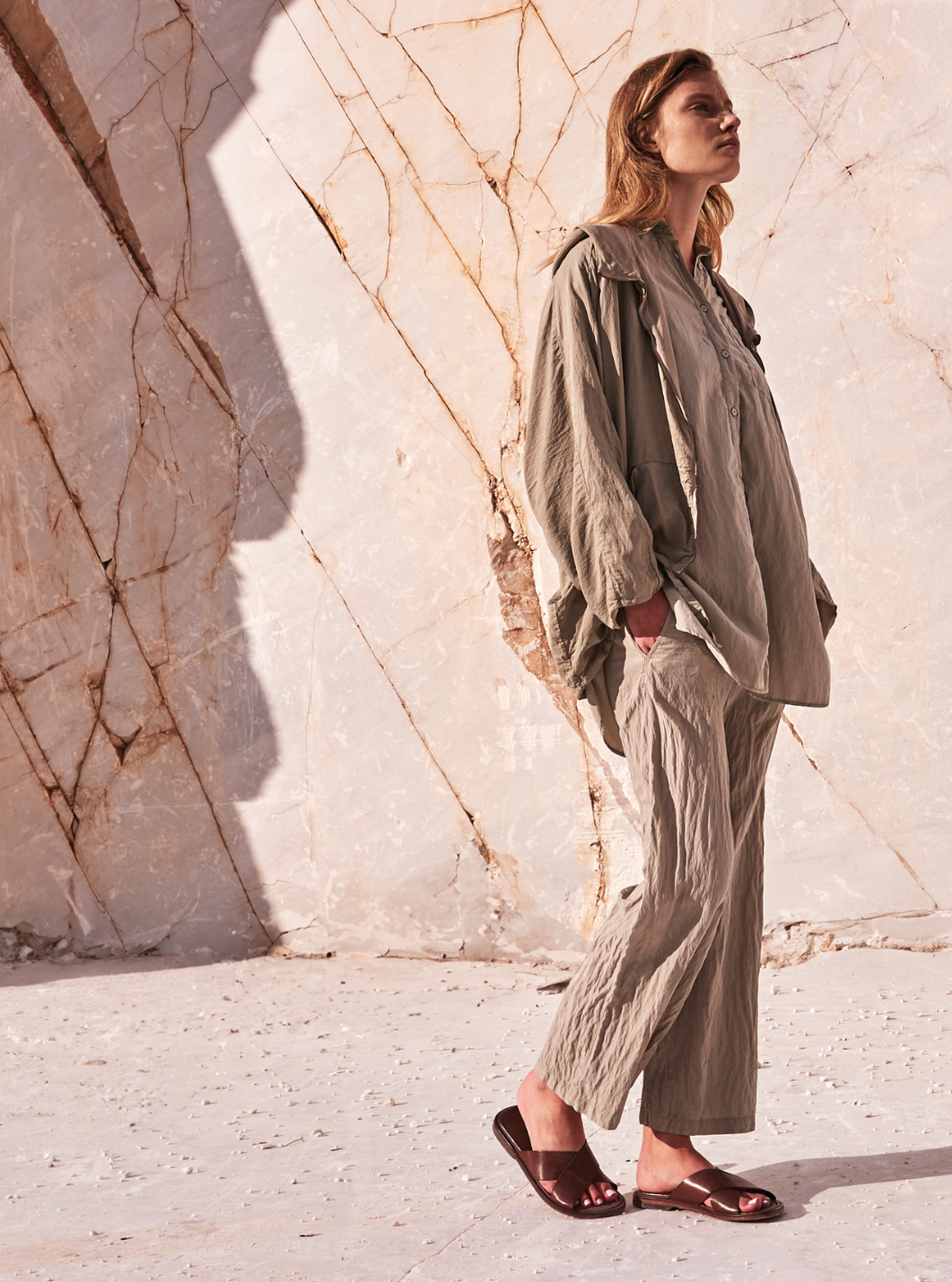 Eine minimalistische und zugleich elegante Sandale, die die für die Welt von TRANSIT typische authentische Qualität und den gewohnten Komfort verkörpert. Das streng pflanzlich gegerbte Rindsleder zeigt sich ganz unverfälscht: Falten, Spuren und Unvollkommenheiten werden zu einem Mehrwert und verwandeln sich in Zeichen von Identität und Schönheit.
