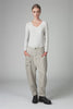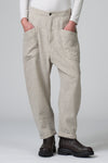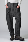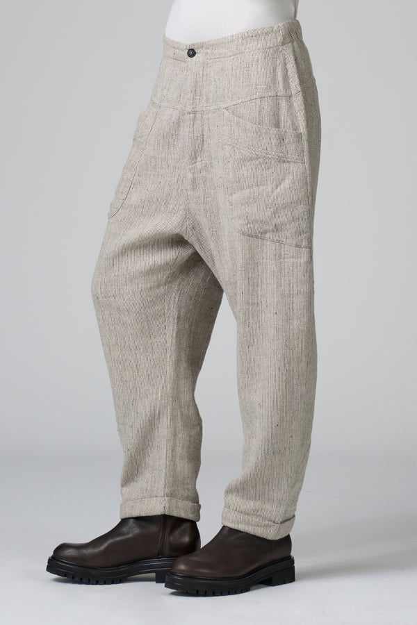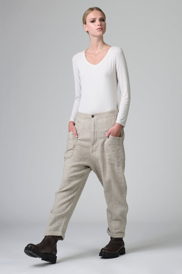 Comfortable-fit trousers with a slightly dropped crotch and a buttoned hem. The waistband features an elastic waistband at the back. The piece, made of soft, stretchy wool-linen blend fabric with a herringbone pattern, features two patch pockets under the yoke. The front opening is zip and button.