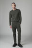Regular-fit, garment-dyed ergonomic trousers made of compact cotton and elastane gabardine. Waist fastened with a metal button with an aged-effect coating. Zip fly. Half-elastic waistband. Belt loops. Stitched patch on the right side, with T-shaped bar tacks. Frog mouth front pockets. Welt back pockets. Side and yoke felled with prominent, thick cotton thread. Hanging loop label.