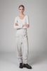 Pantalone con vestibilità morbida e stretto al fondo da polsini e pence. realizzato in maglia di lana-cotone. il capo si caratterizza da un'alta cintura in maglia, tagli arrotondati sul davanti dove sono inserite le tasche a toppa con bordo in costa e un'apertura zip estetica sul davanti.