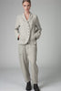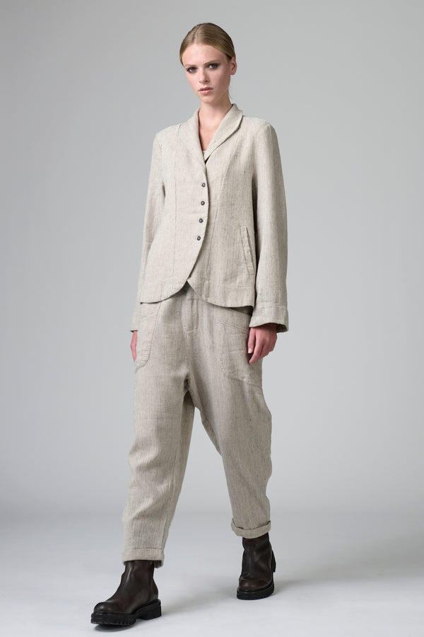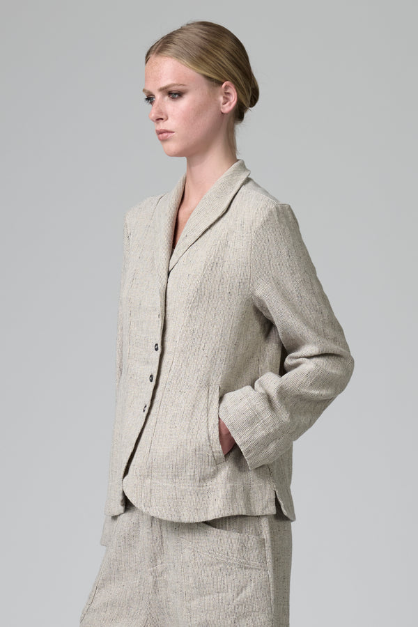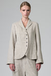 Giacca sfoderata realizzata in morbido tessuto elastico, misto lana e lino con disegnatura spina pesce. la vestibilita' e' regolare leggermente svasata. il capo si presenta con collo all'americana, 2 tasche a filetto diagonali, 2 spacchi al fondo ed e' arricchito da abbottonatura con motivo arcuato.