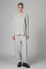 Camicia sagomata, realizzata in rigatino di cotone-lino, si caratterizza dal collo alla coreana, per l'abbottonatura nascosta e per gli spacchi al fondo. 2 bottoni su fondo manica arricchiscono il capo.
