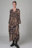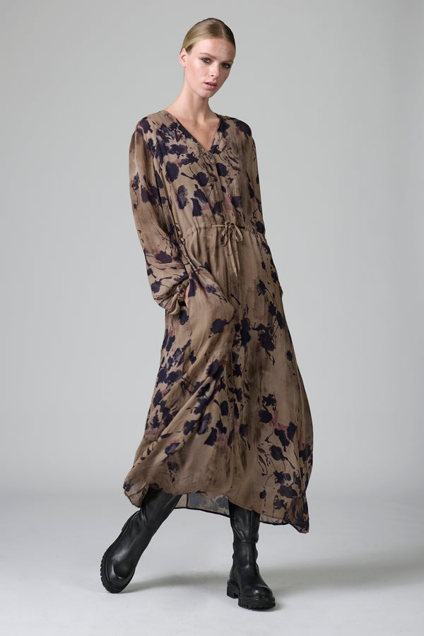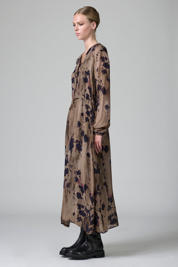 Abito lungo alla caviglia sfoderato, realizzato in georgette di viscosa stampato. scollo a v con apertura a bottoncini. capo arricchito da coulisse in vita, ed elastico su fondo manica. tasche sul fianco.
