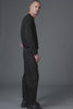 Pantalone ergonomico lavato in capo, in tessuto spinato in cotone e lana che simula la lavorazione del denim. vita e patta chiuse da bottoni di metallo con galvanica invecchiata, passanti frontali costruiti fra i tagli, tasche frontali alla francese, tasche posteriori a filo del carrè con etichetta staccabile nella destra, gambe arquate, cucitura con punto speciale grosso che parte dal bacino posteriore e arriva al fondo anteriore, etichetta a piccanello.