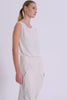 Pantalone con gamba larga, arcuata e cavallo basso, realizzato in tessuto di lino unito. Il capo è arricchito sul davanti da una patta rimessa con bottoni che copre la zip, grandi tasche a soffietto dalla forma arrotondata con entrata tasca con filetto, da pinces sul ginocchio, fianco spostato verso il davanti e da spacco sormontato al fondo. Sul dietro presenta uno spacco a V sulla cintura, un taglio lungo tutta la gamba e pince cucita. Tinto capo.